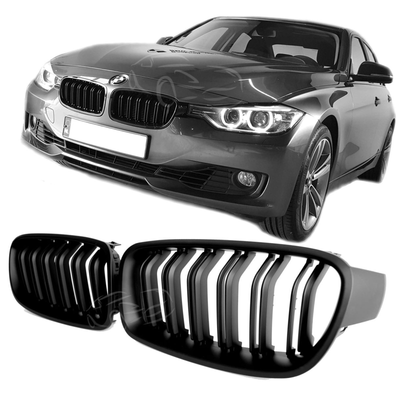 Sportowy grill typu double slat do BMW serii 3 F30 (sedan) i F31 (kombi), produkowanych w latach 11/2011–02/2019. Wersja w matowej czerni, stylizowana na M-performance. Produkt idealnie pasuje do fabrycznych punktów montażowych – bez potrzeby cięcia czy przerabiania.