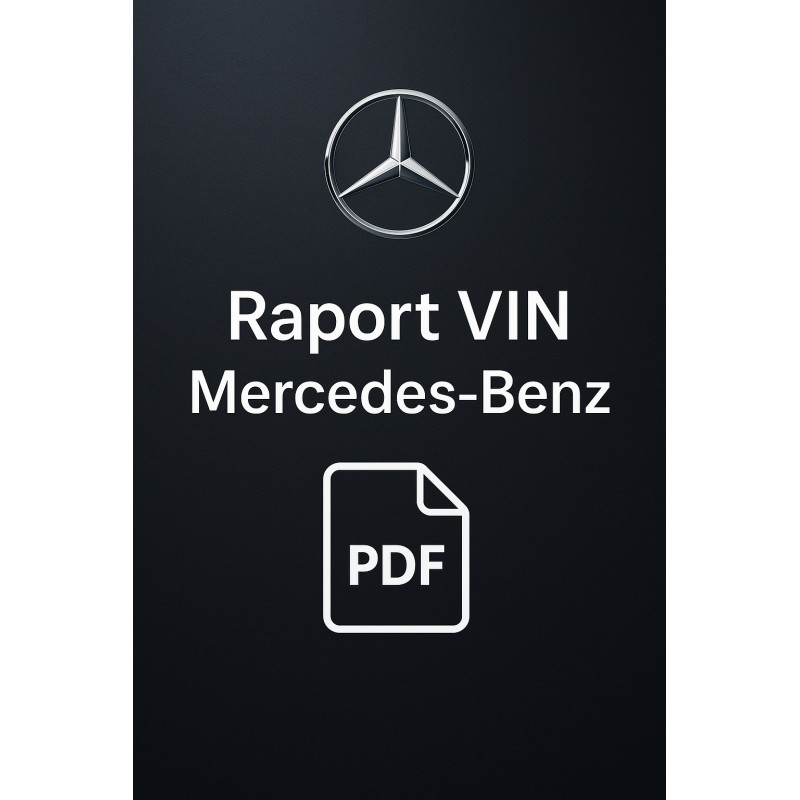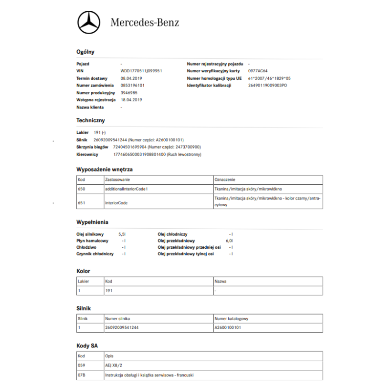 Sprawdź szczegółowe dane swojego Mercedesa po numerze VIN. Otrzymaj pełny raport wyposażenia w formacie PDF z systemu wewnętrznego Mercedes-Benz: data produkcji, numer silnika, skrzyni biegów, kod lakieru i wiele więcej. Idealne przy zakupie lub naprawie auta!