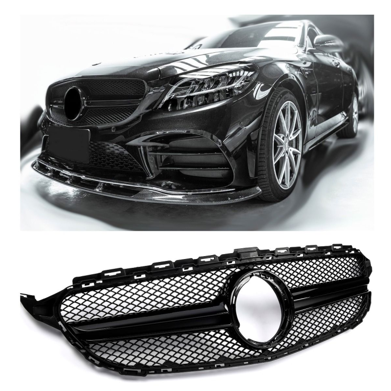 Najniższa cena ostatnie 30 dni: 485 zł Grill sportowy Mercedes Klasa C W205 Facelift 03/2018-2021 (sedan / kombi / coupe / cabrio) – pełna czarna atrapa chłodnicy high-gloss (Avantgarde / AMG-Line, z Distronic). ABS premium, błyszcząca total black, wymiana 1:1, gwiazda z oryginału.